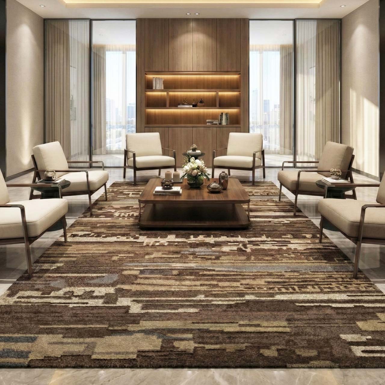 Hand-tufted in an 80% wool and 20% nylon blend, Aurai balances natural warmth with enhanced resilience. Cut, loop and tip-shear finishes create sculpted texture, while skid-resistant backing ensures stability. Designed for refined rooms and light public spaces requiring comfort and durability.