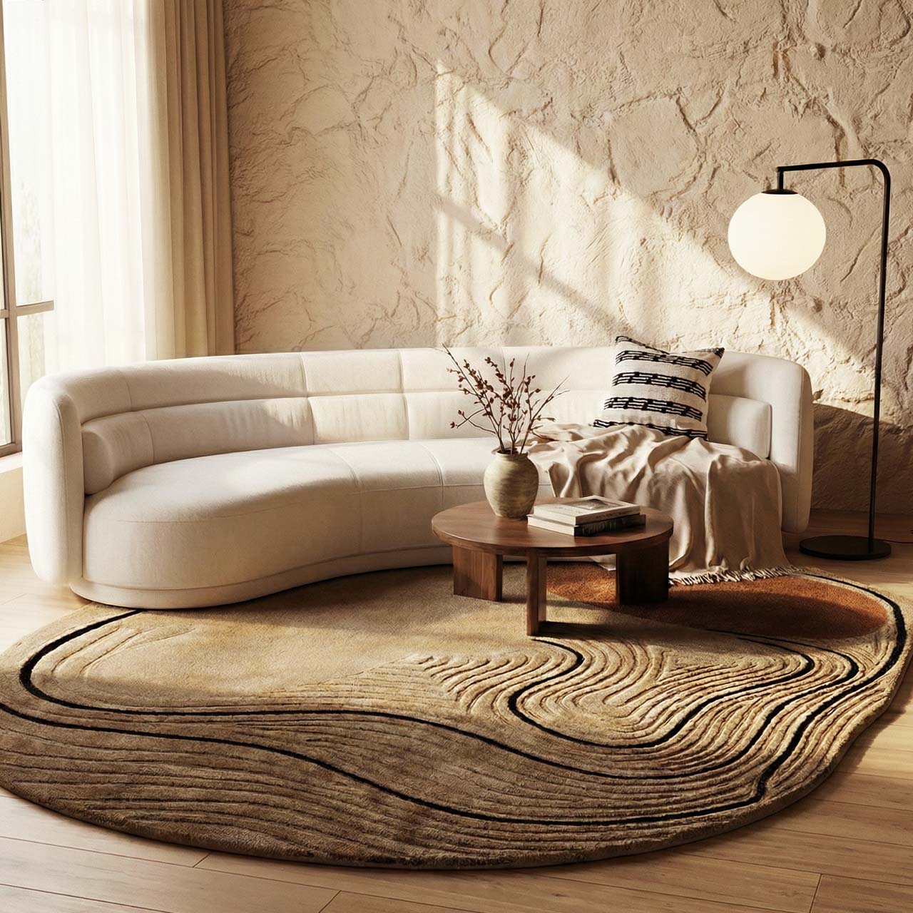 Hand-tufted in a wool, nylon and viscose blend, Mirzapur combines softness, sheen and strength. Sculpted cut, loop and tip-shear finishes add depth, while dotted felt backing enhances comfort and stability. Designed exclusively for refined residential interiors.